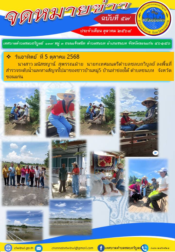 ชื่อเรื่อง : วันอาทิตย์ ที่ 5 ตุลาคม 2568นางสาว มนัสชญาน์ สุพรรณฝ่าย นายกเทศมนตรีตำบลชลบถวิบูลย์ ลงพื้นที่สำรวจระดับน้ำและทางสัญจรไปมาของชาวบ้านหมู่5 บ้านท่าข่อยใต้ ตำบลชนบท จังหวัดขอนแก่น